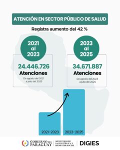 El análisis comparativo de los registros oficiales muestra que en el período anterior, de agosto del 2021 a julio del 2023 se contabilizaron 24.446.726 atenciones, en el periodo actual, de agosto del 2023 a julio del 2025, la cifra ascendió a 34.671.887, evidenciando un incremento en el uso de los servicios de salud pública a nivel nacional.