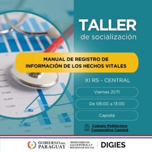 A fin de unificar criterios y garantizar datos más precisos para la toma de decisiones, la Dirección General de Información Estratégica en Salud (DIGIES) lleva adelante talleres de socialización del “Manual de Normas y Procedimientos de Registros de Información de los Hechos Vitales”, a nivel país. El próximo evento tendrá lugar este viernes 21 de noviembre, con la participación de médicos de los sectores público y privado, forenses, representantes del Registro Civil, estadígrafos y otros profesionales vinculados al registro de nacimientos y defunciones, en el departamento Central.