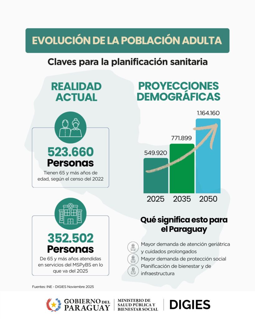 El análisis concluyó que Paraguay debe anticiparse a estos cambios mediante políticas públicas sostenidas que garanticen derechos, equidad y calidad de vida para las personas mayores. En ese contexto, es importante mencionar que el Ministerio de Salud, el Ministerio de Desarrollo Social, el Instituto Nacional de Estadística y otras instituciones conformaron una mesa de trabajo para analizar la situación actual y las proyecciones que se manejan para los próximos años, con el fin de establecer acciones que permitan ofrecer como país una respuesta acorde a las necesidades de este sector de la población.